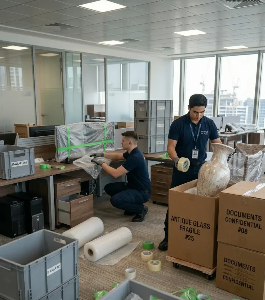Every piece going through a corridor or elevator gets wrapped before it moves. Wooden furniture is covered with thick protective blankets. Electronics like TVs, washing machines and fridges get double-layer bubble wrap and reinforced cartons. Mirrors and glass are wrapped in special paper and moved upright to prevent breakage. All screws and fittings go into numbered bags so reassembly is clean and fast.